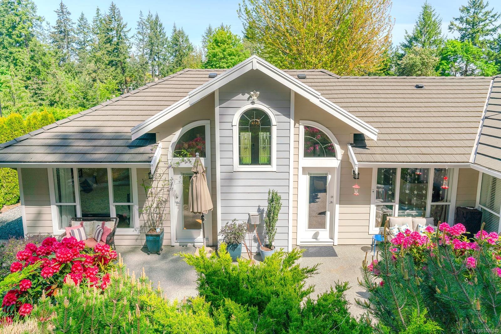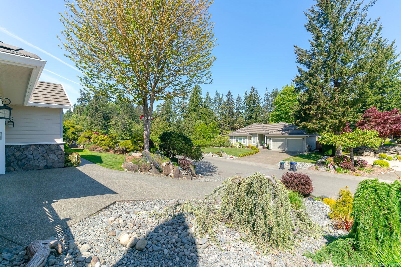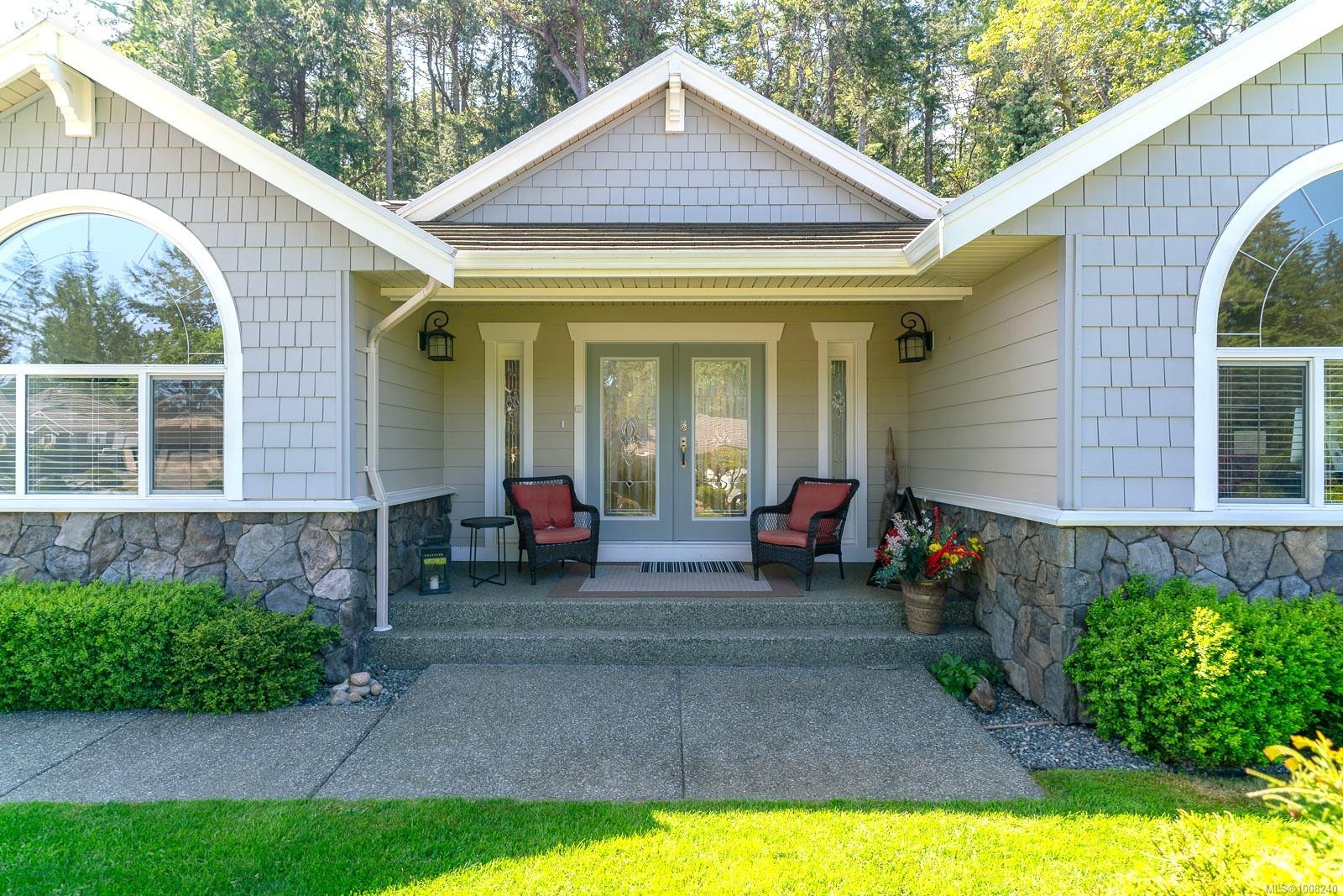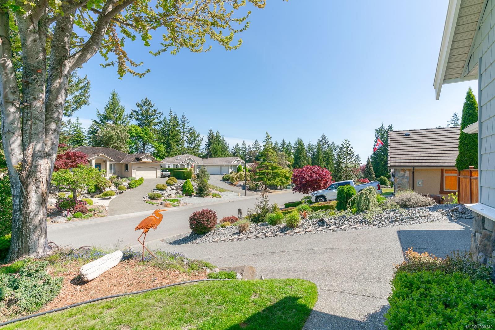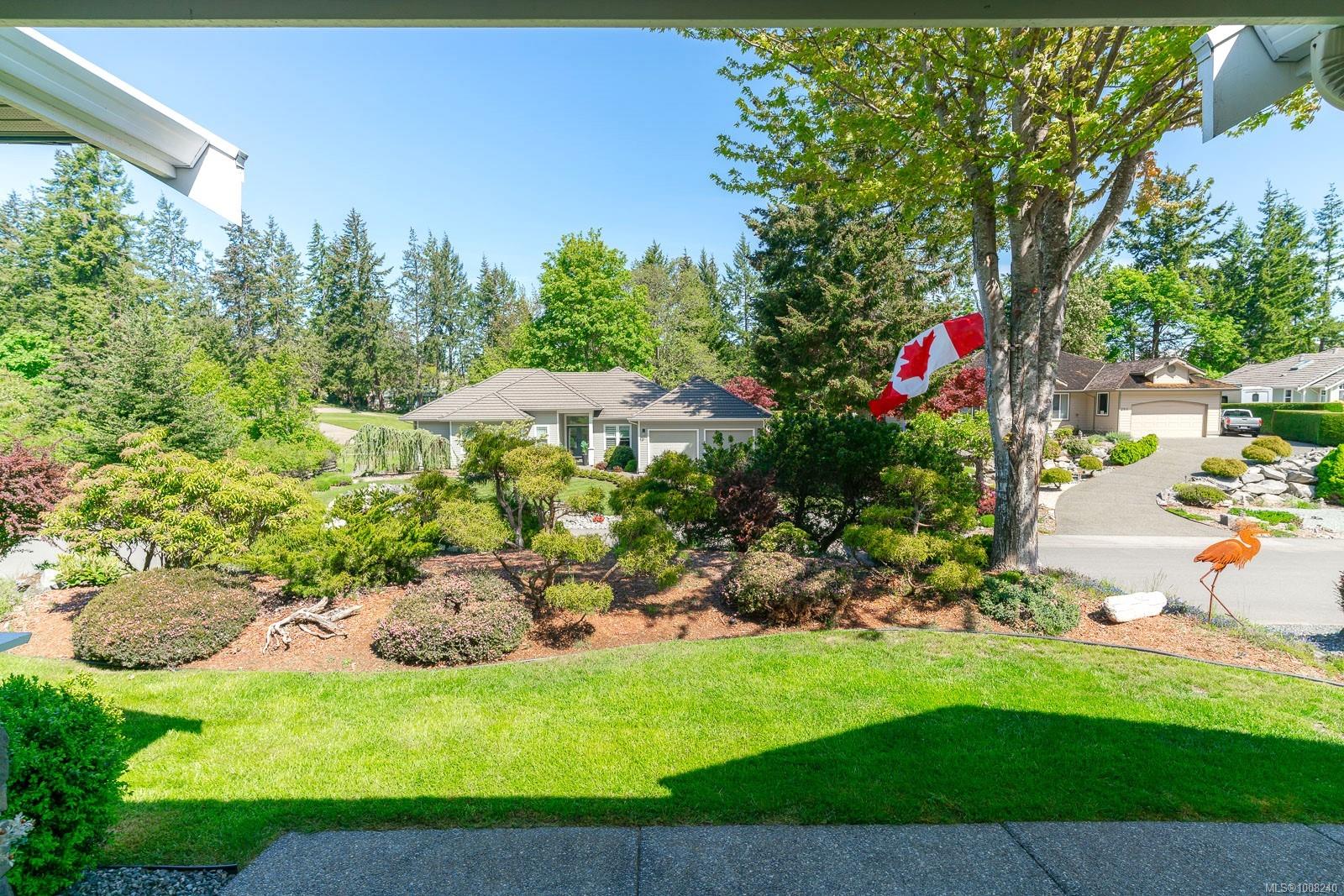 Golfer’s Paradise! Located in the Fairwinds community, this executive rancher offers spacious main-level living in a peaceful neighbourhood located just steps to the golf course. You're welcomed by an expansive entrance & newly installed engineered hardwood flooring in this upgraded & impeccably maintained 2 bedroom plus den, 2 bath home. This home is further highlighted with quality finishing, high ceilings & large airy rooms with expansive windows to take in the natural light, treed backdrop & golf course views. The gourmet kitchen includes granite counters, stainless steel appliances, a natural gas stove & ample storage -- opening to an adjoining seating nook or flex space perfect for your morning coffee. Entertain with ease in the large dining room highlighted with classic wainscoting or in the spacious living room with a cozy gas fireplace & vaulted ceiling which overlooks the beautifully landscaped yard. The private primary suite offers a walk-in closet & spectacular 5pc. ensuite with soaker tub & walk-in shower. The thoughtful floorplan provides privacy, with an additional bedroom, den & 4-piece bath on the opposite side of the home. Additional features include a well-appointed laundry room & ample storage throughout. Backing onto crown land for added ambiance, the outdoor living areas include a private patio, fully landscaped & fenced yard with mature landscaping, irrigation and new stairs for easy access to the upper yard. Perfectly positioned to enjoy the Fairwinds lifestyle with the Golf Course right across the street and just steps to the Fairwinds Wellness Centre with gym, pool, tennis, and pickleball courts. Enjoy nearby scenic beaches, Marina, Schooner Cove, Brickyard Park & miles of forested walking trails -- this location offers the ultimate in active, coastal living. If you're looking for pristine one-level living in a serene & scenic setting, this is the one—your ideal lifestyle starts here. Data & measurements approximate, verify if important.