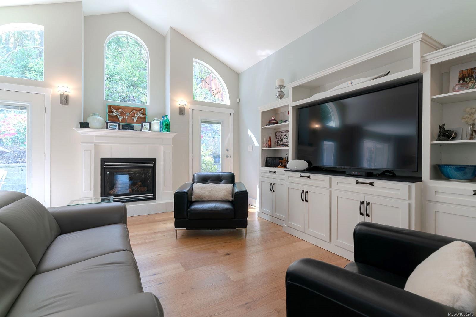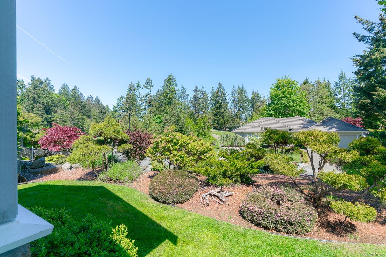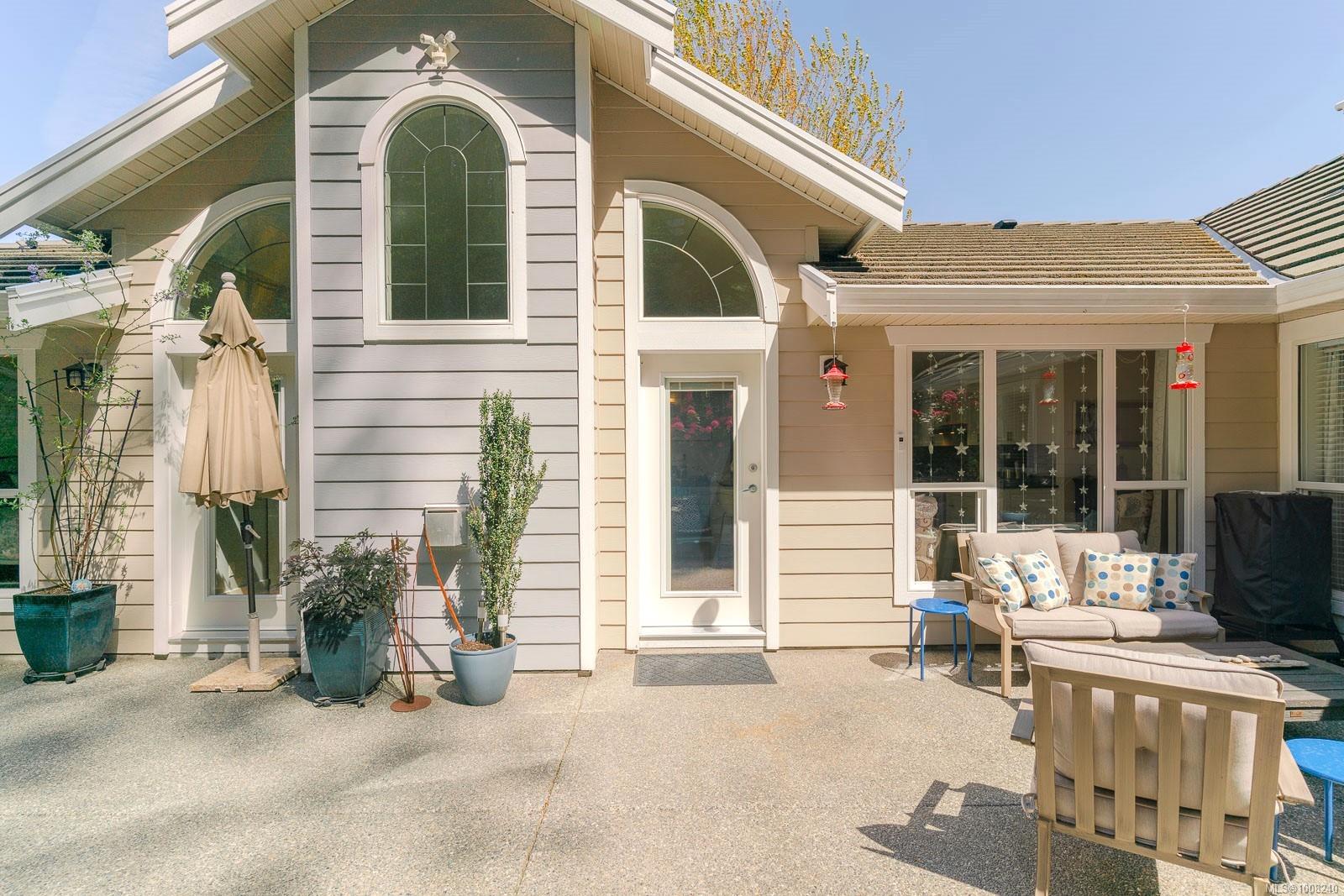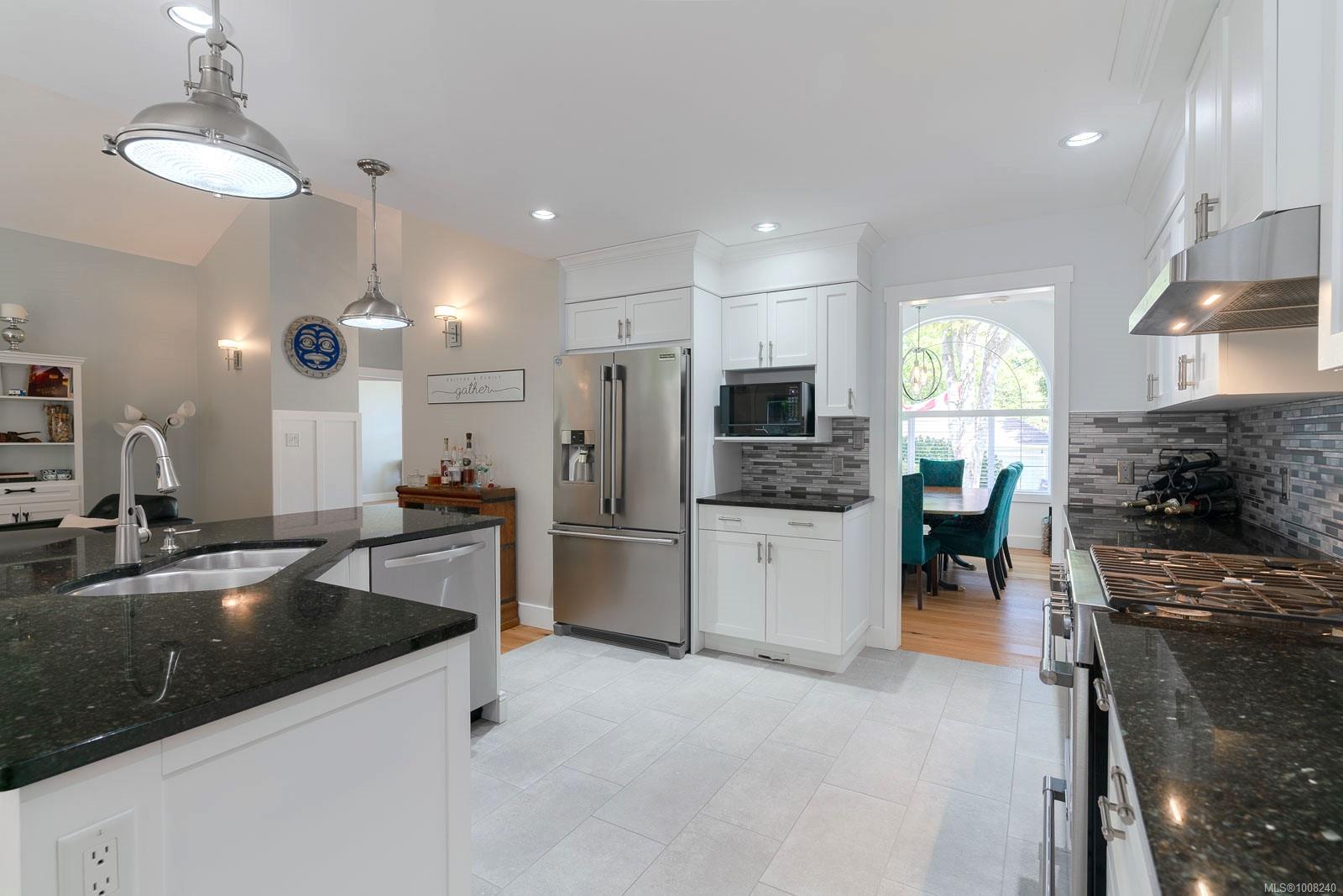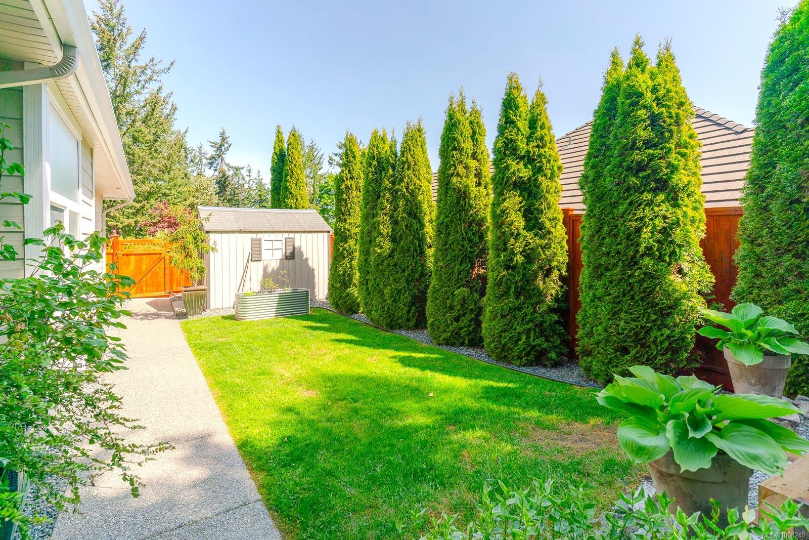 Golfer’s Paradise! Located in the Fairwinds community, this executive rancher offers spacious main-level living in a peaceful neighbourhood located just steps to the golf course. You're welcomed by an expansive entrance & newly installed engineered hardwood flooring in this upgraded & impeccably maintained 2 bedroom plus den, 2 bath home. This home is further highlighted with quality finishing, high ceilings & large airy rooms with expansive windows to take in the natural light, treed backdrop & golf course views. The gourmet kitchen includes granite counters, stainless steel appliances, a natural gas stove & ample storage -- opening to an adjoining seating nook or flex space perfect for your morning coffee. Entertain with ease in the large dining room highlighted with classic wainscoting or in the spacious living room with a cozy gas fireplace & vaulted ceiling which overlooks the beautifully landscaped yard. The private primary suite offers a walk-in closet & spectacular 5pc. ensuite with soaker tub & walk-in shower. The thoughtful floorplan provides privacy, with an additional bedroom, den & 4-piece bath on the opposite side of the home. Additional features include a well-appointed laundry room & ample storage throughout. Backing onto crown land for added ambiance, the outdoor living areas include a private patio, fully landscaped & fenced yard with mature landscaping, irrigation and new stairs for easy access to the upper yard. Perfectly positioned to enjoy the Fairwinds lifestyle with the Golf Course right across the street and just steps to the Fairwinds Wellness Centre with gym, pool, tennis, and pickleball courts. Enjoy nearby scenic beaches, Marina, Schooner Cove, Brickyard Park & miles of forested walking trails -- this location offers the ultimate in active, coastal living. If you're looking for pristine one-level living in a serene & scenic setting, this is the one—your ideal lifestyle starts here. Data & measurements approximate, verify if important.