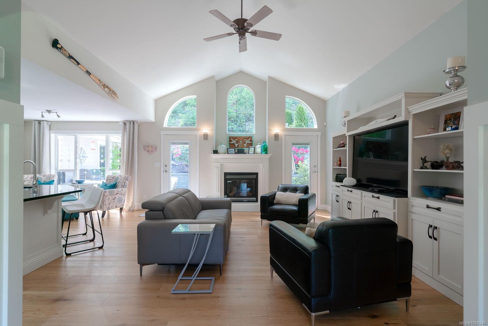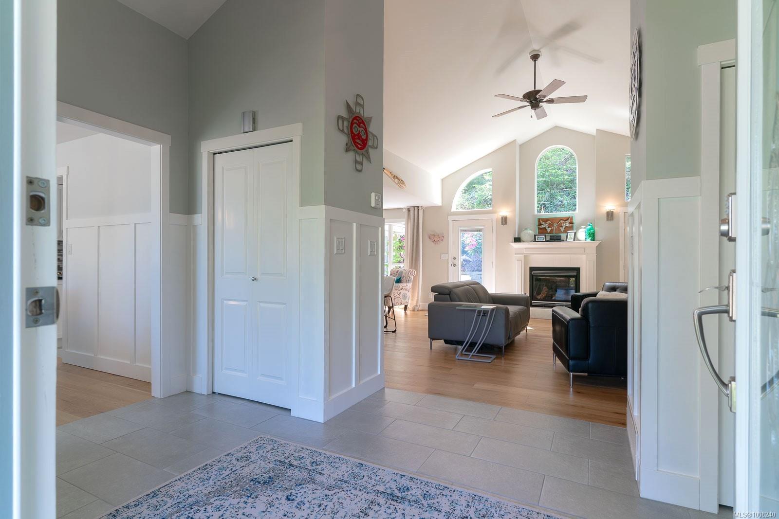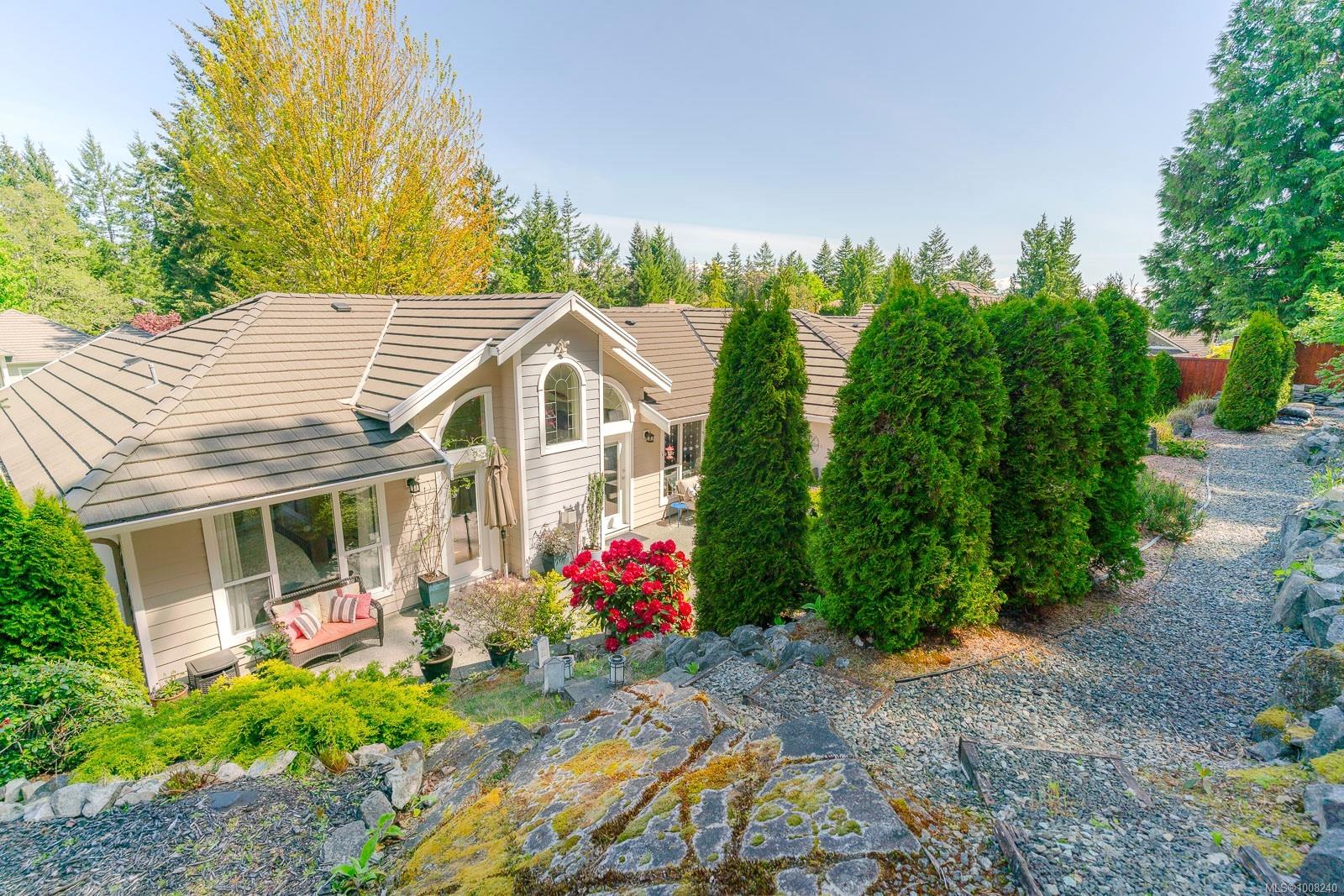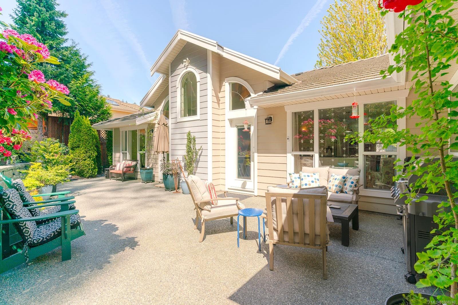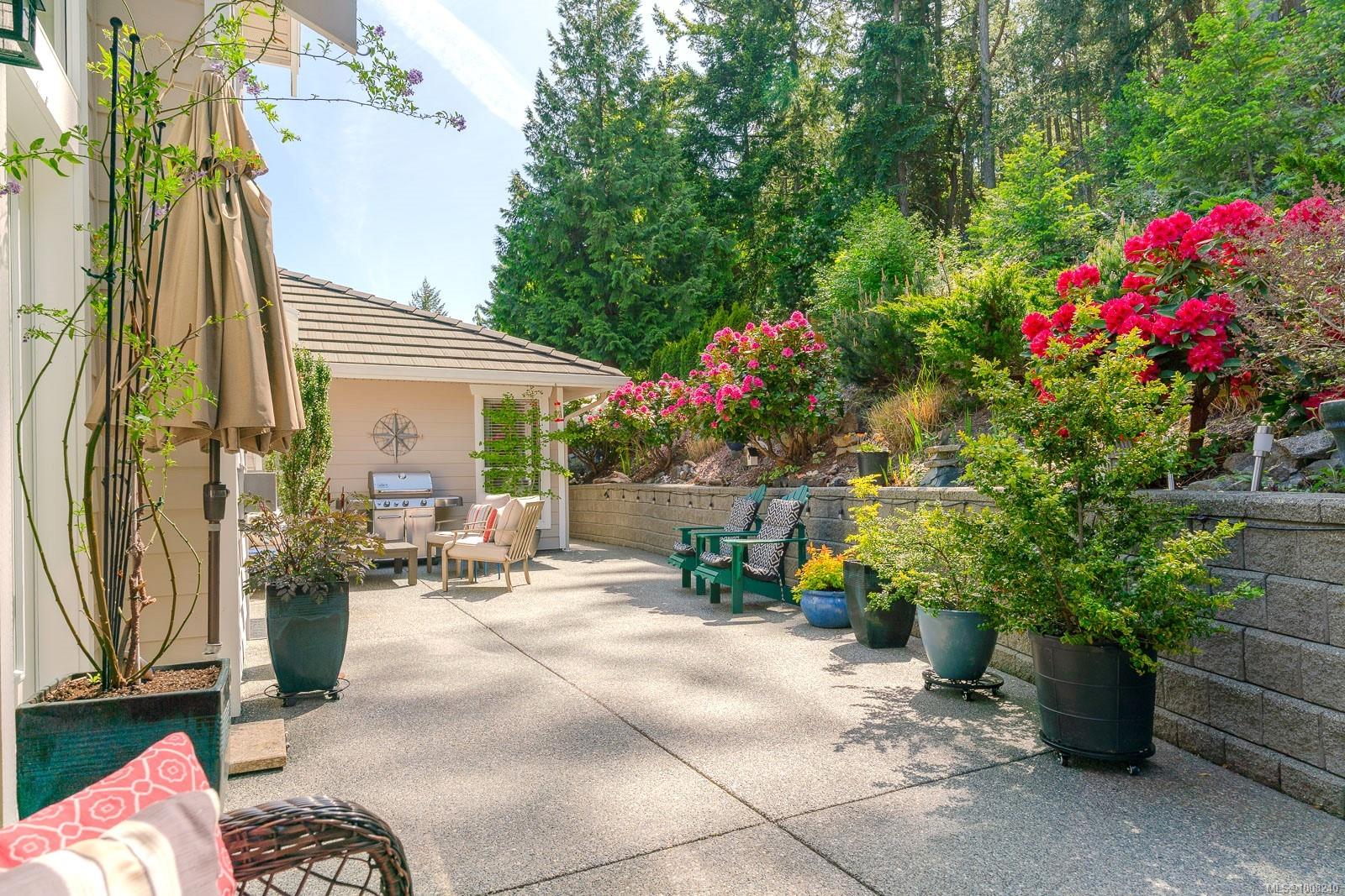 Golfer’s Paradise! Located in the Fairwinds community, this executive rancher offers spacious main-level living in a peaceful neighbourhood located just steps to the golf course. You're welcomed by an expansive entrance & newly installed engineered hardwood flooring in this upgraded & impeccably maintained 2 bedroom plus den, 2 bath home. This home is further highlighted with quality finishing, high ceilings & large airy rooms with expansive windows to take in the natural light, treed backdrop & golf course views. The gourmet kitchen includes granite counters, stainless steel appliances, a natural gas stove & ample storage -- opening to an adjoining seating nook or flex space perfect for your morning coffee. Entertain with ease in the large dining room highlighted with classic wainscoting or in the spacious living room with a cozy gas fireplace & vaulted ceiling which overlooks the beautifully landscaped yard. The private primary suite offers a walk-in closet & spectacular 5pc. ensuite with soaker tub & walk-in shower. The thoughtful floorplan provides privacy, with an additional bedroom, den & 4-piece bath on the opposite side of the home. Additional features include a well-appointed laundry room & ample storage throughout. Backing onto crown land for added ambiance, the outdoor living areas include a private patio, fully landscaped & fenced yard with mature landscaping, irrigation and new stairs for easy access to the upper yard. Perfectly positioned to enjoy the Fairwinds lifestyle with the Golf Course right across the street and just steps to the Fairwinds Wellness Centre with gym, pool, tennis, and pickleball courts. Enjoy nearby scenic beaches, Marina, Schooner Cove, Brickyard Park & miles of forested walking trails -- this location offers the ultimate in active, coastal living. If you're looking for pristine one-level living in a serene & scenic setting, this is the one—your ideal lifestyle starts here. Data & measurements approximate, verify if important.