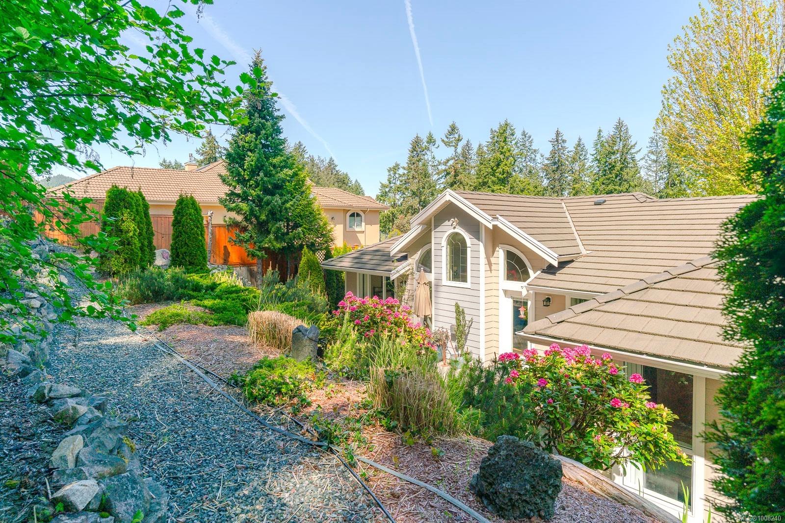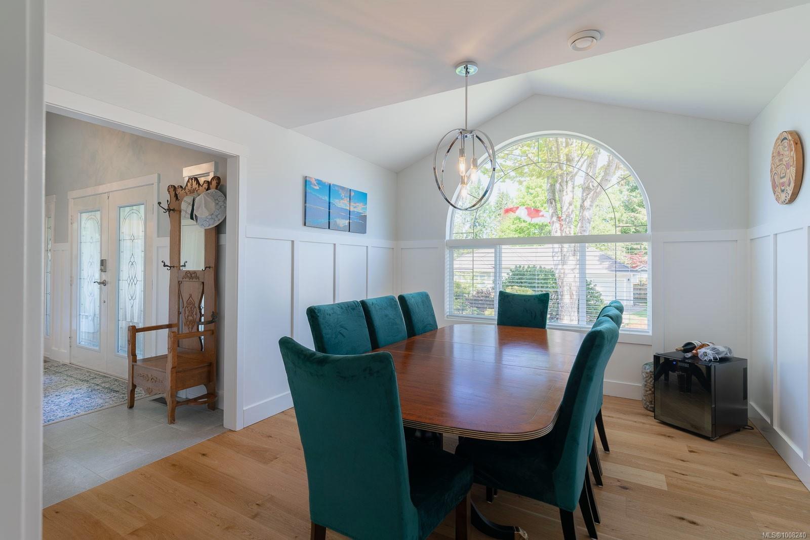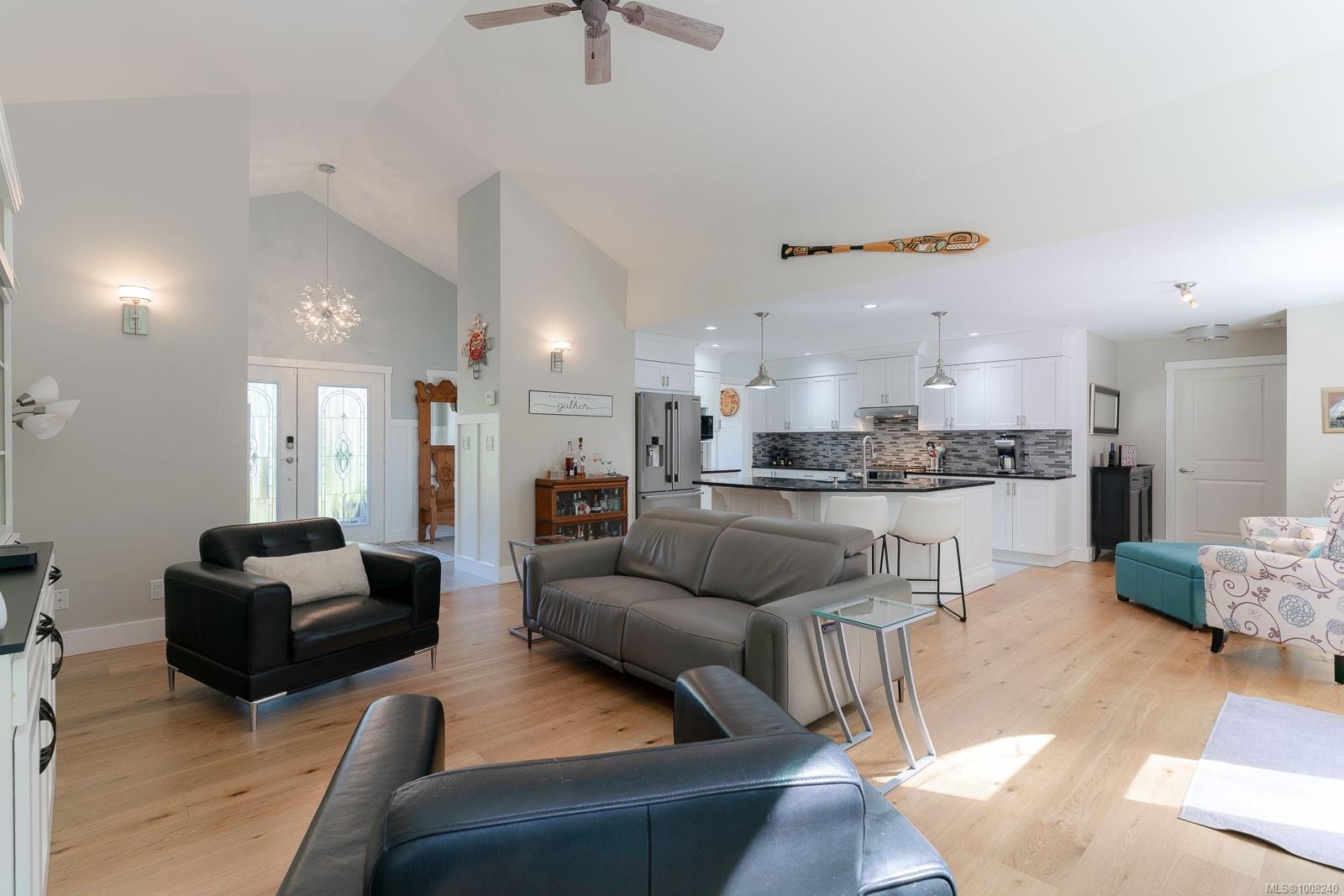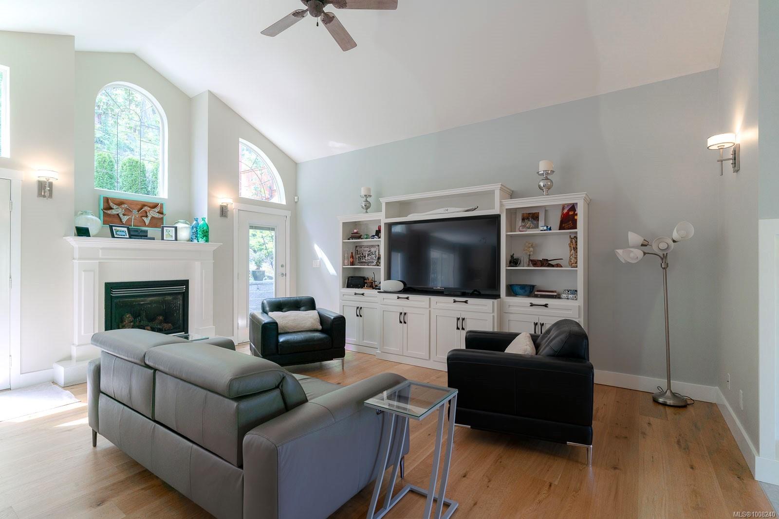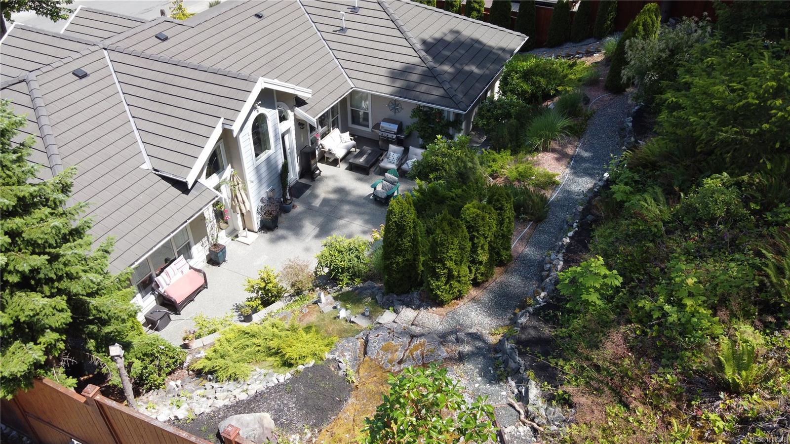 Golfer’s Paradise! Located in the Fairwinds community, this executive rancher offers spacious main-level living in a peaceful neighbourhood located just steps to the golf course. You're welcomed by an expansive entrance & newly installed engineered hardwood flooring in this upgraded & impeccably maintained 2 bedroom plus den, 2 bath home. This home is further highlighted with quality finishing, high ceilings & large airy rooms with expansive windows to take in the natural light, treed backdrop & golf course views. The gourmet kitchen includes granite counters, stainless steel appliances, a natural gas stove & ample storage -- opening to an adjoining seating nook or flex space perfect for your morning coffee. Entertain with ease in the large dining room highlighted with classic wainscoting or in the spacious living room with a cozy gas fireplace & vaulted ceiling which overlooks the beautifully landscaped yard. The private primary suite offers a walk-in closet & spectacular 5pc. ensuite with soaker tub & walk-in shower. The thoughtful floorplan provides privacy, with an additional bedroom, den & 4-piece bath on the opposite side of the home. Additional features include a well-appointed laundry room & ample storage throughout. Backing onto crown land for added ambiance, the outdoor living areas include a private patio, fully landscaped & fenced yard with mature landscaping, irrigation and new stairs for easy access to the upper yard. Perfectly positioned to enjoy the Fairwinds lifestyle with the Golf Course right across the street and just steps to the Fairwinds Wellness Centre with gym, pool, tennis, and pickleball courts. Enjoy nearby scenic beaches, Marina, Schooner Cove, Brickyard Park & miles of forested walking trails -- this location offers the ultimate in active, coastal living. If you're looking for pristine one-level living in a serene & scenic setting, this is the one—your ideal lifestyle starts here. Data & measurements approximate, verify if important.