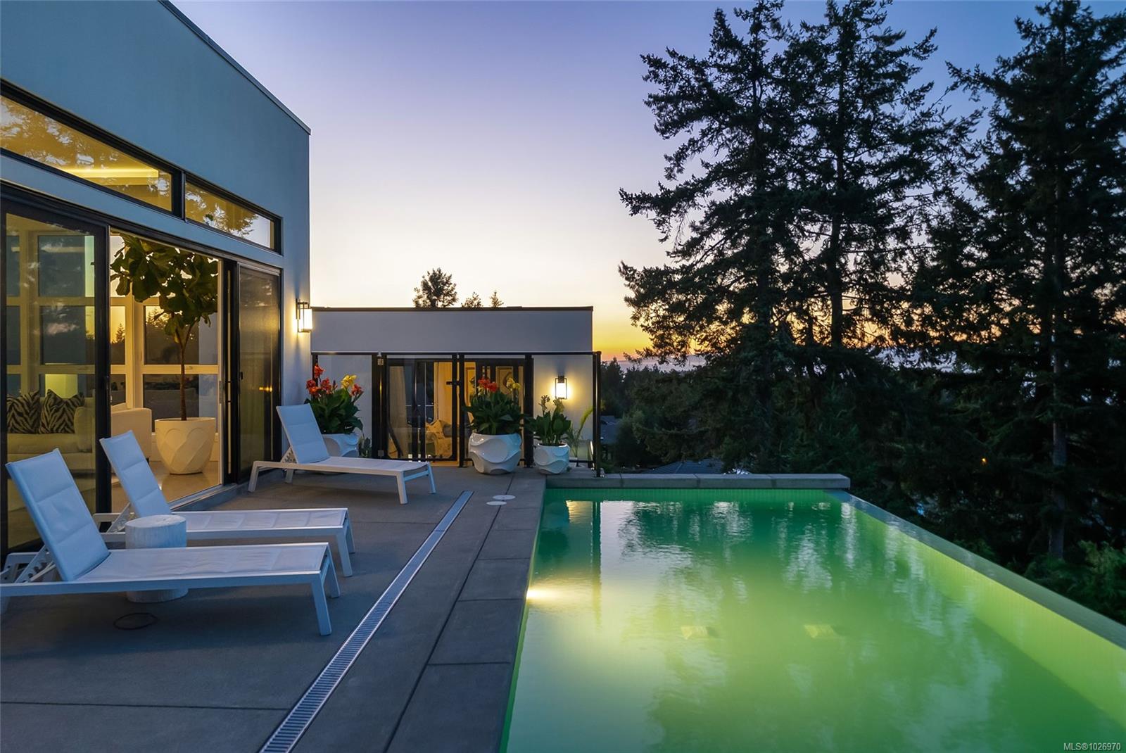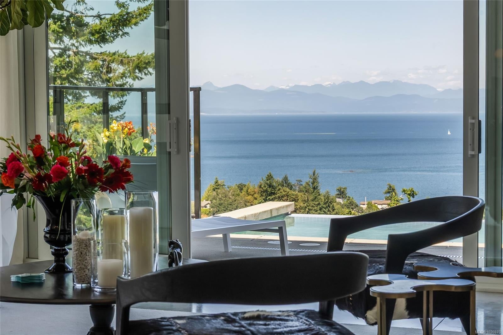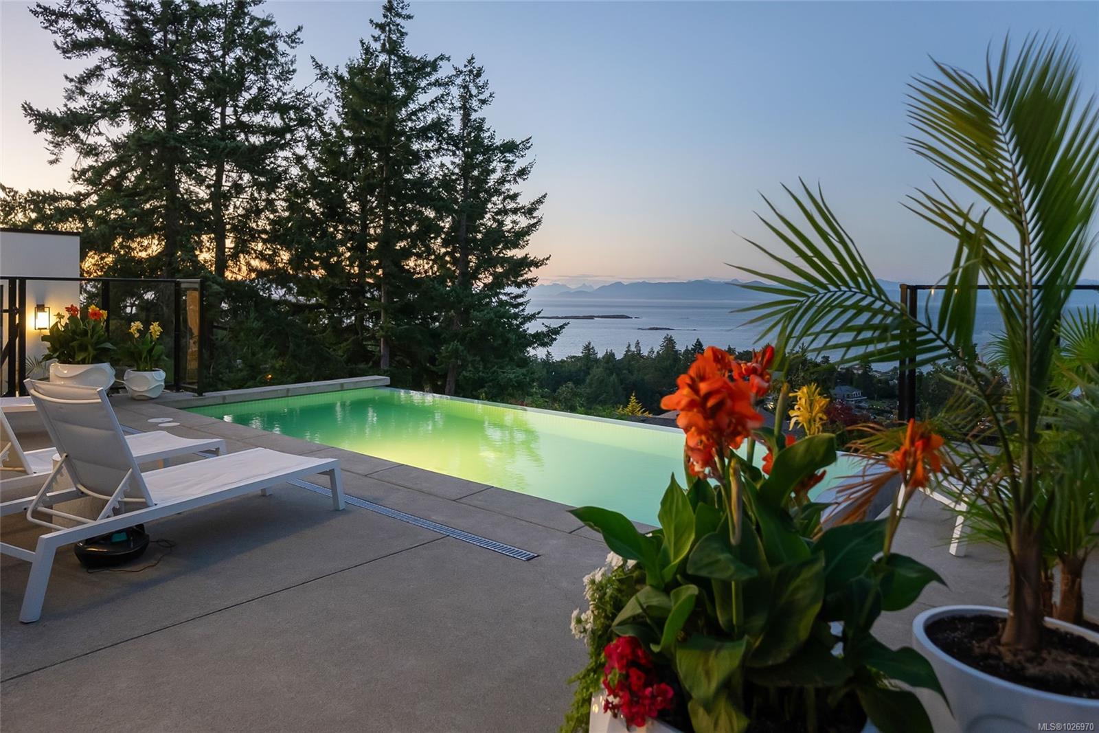 Exquisite Fairwinds Villa with captivating Ocean Views. Once in a lifetime opportunity to own a glorious custom home with elegant designer details in every room. The great room will captivate your imagination, flooded with natural light, soaring ceilings and a dazzling open plan Kitchen (with Butlers pantry), all flowing out onto a generous patio for al fresco dining with an infinity pool framing the magnificent Ocean vistas. Relax in your luxurious Primary Suite with glamorous walk in closet and blissful ensuite. Generous guest accommodations, both in the main house and in the separate studio allow for gathering of family and friends. Art niches and inspiring light fixtures allow you to create artistic scenes throughout your home. This unique architectural home nestled into low maintenance landscaping will allow you to live Your Vancouver Island Dream Today.
