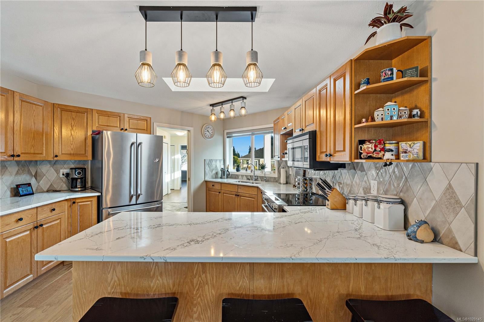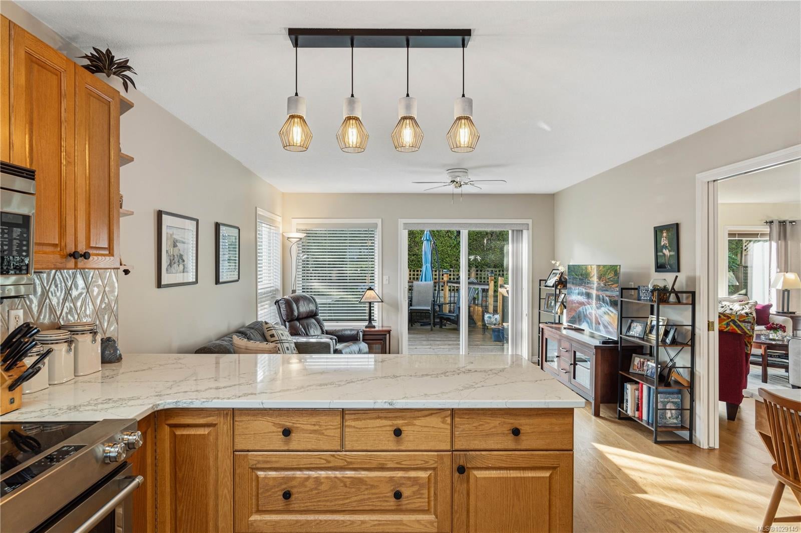 Stroll down to the Beach at Eaglecrest from this lovely updated, free-standing home in the Oceanside Complex. This sought after Development is a Bare Land Strata with a monthly fee of just $89 covering the maintenance of the common gardens especially the magnificent and much admired hanging flower baskets around the 4 streets making up the Complex. This home has been exceptionally well maintained and is immaculate inside The Roof is about 10 years old. New Furnace in 2023 New Hot Water tank in 2025.Added Drinking Water filtration system 2023. New Deck railings in 2023. Added small garden shed in 2023. New Quartz kitchen Countertops, sink and faucet in 2025 .Added Barn Door and extra storage in Laundry room in 2024. Installed white oak Engineered Hardwood throughout in 2023. Total professional removal of Poly B piping by Browns Plumbing March 2026 All new Bosch/Kitchen Aid Appliances and Microwave in 2024 Dryer vents cleaned out 2026. New Dryer in 2026 The spacious oak kitchen is open to the generous Family room for cozy TV watching and features large doors to the deck for easy family entertaining and cook-outs. A large Living room/dining room with gas fireplace accommodates larger groups in style. Two generous bedrooms at opposite sides of the home allow privacy for guests. There are mobility helpers in the garage with grab bars everywhere needed. RV Storage in Complex. You cant go wrong here! Call your favourite Realtor!