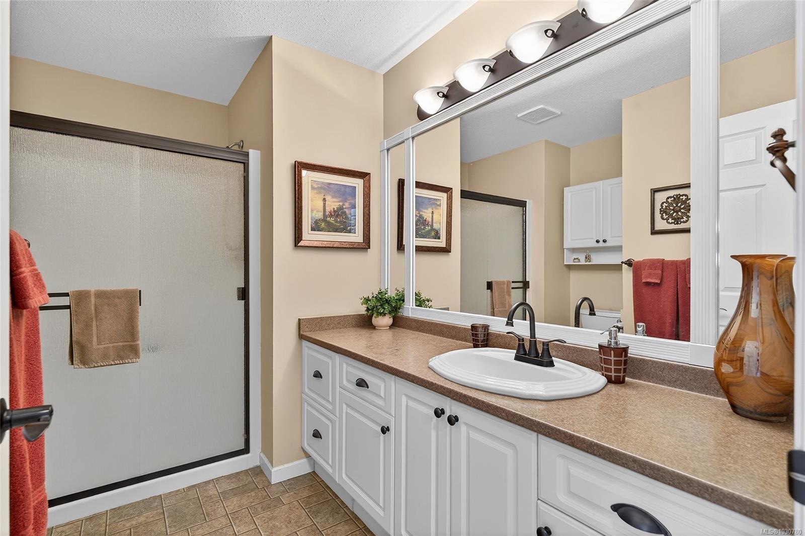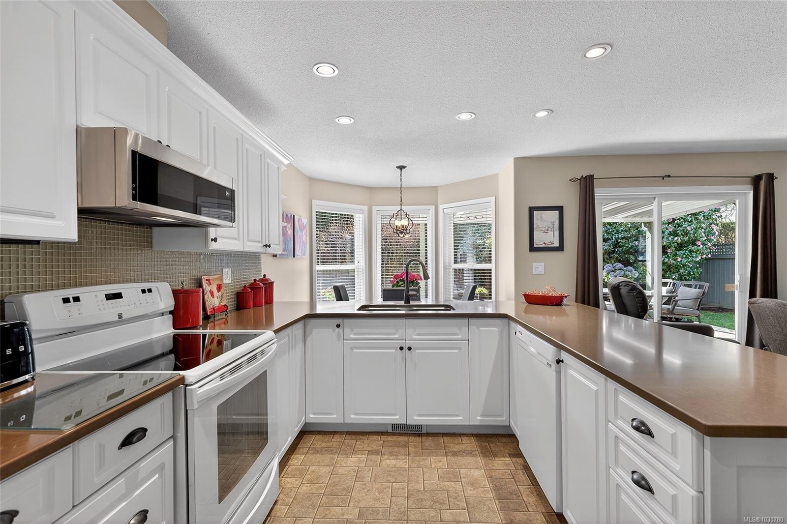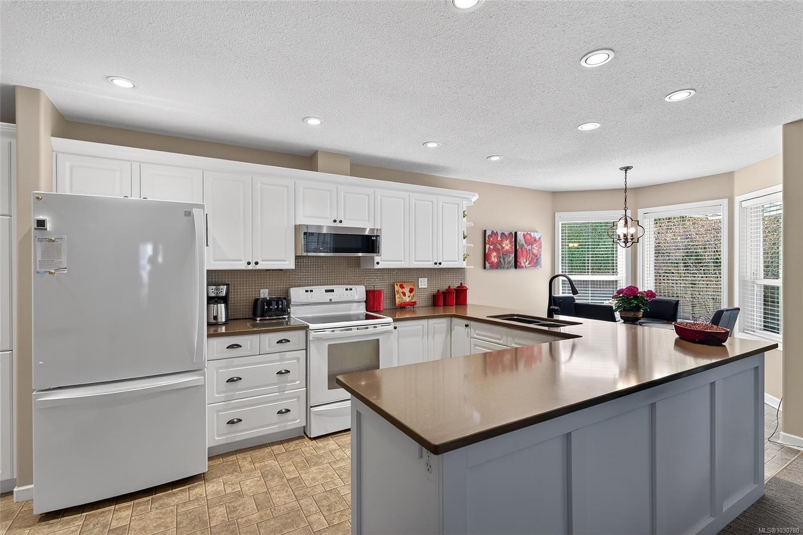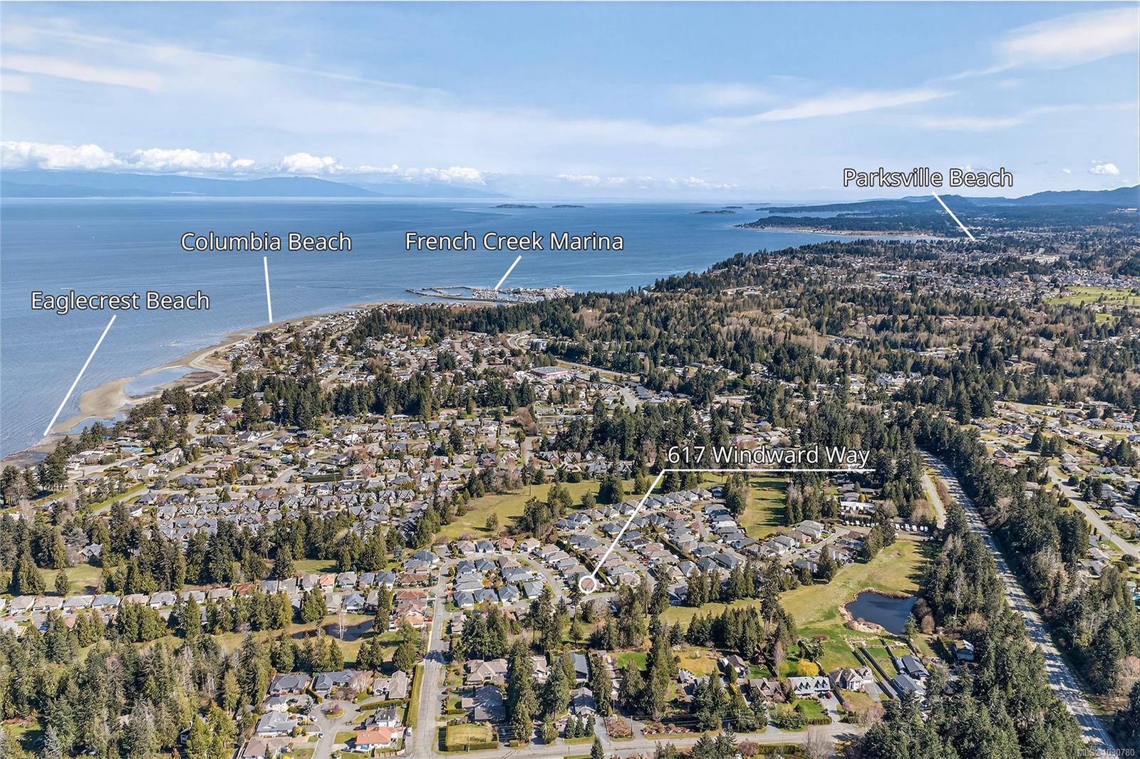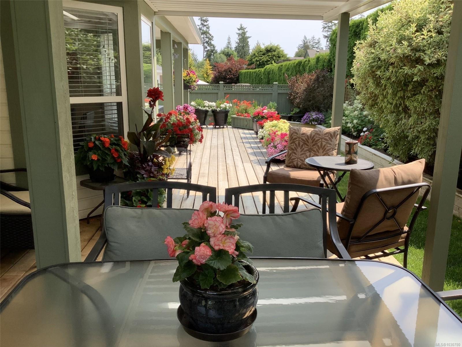 Rarely available! 1800sf, 3bed/2bath rancher at Oceanside in Qualicum Beach! Smell the sea air, walk to the beach or walk the neighbourhood. Beautifully maintained, this floor plan allows everyone their own space. The upgraded kitchen, w/quartz counters, is open to a cozy family room that has great access to the huge, partially covered, south facing deck (2020) & pretty garden. A separate dining room & living room are bright with many windows, & the double garage is a treat to have w/a sink & lots of built in storage. A tiled entry leads to the bedroom wing, where the generous Primary BR at the end of the hall overlooks the garden, has a 4pc skylighted ensuite w/granite counters & restorative views of the garden. The gas furnace & heat pump make for reasonable utilities, the Poly B has been removed, the HW tank is 6yrs & the roof approx. 13yrs. Low strata fee of 97/month, no age restrictions & pets are welcomed. Nothing to do but to move in & enjoy life in the friendly Oceanside community. Easy access to the newest dedicated parkland in Qualicum Beach.